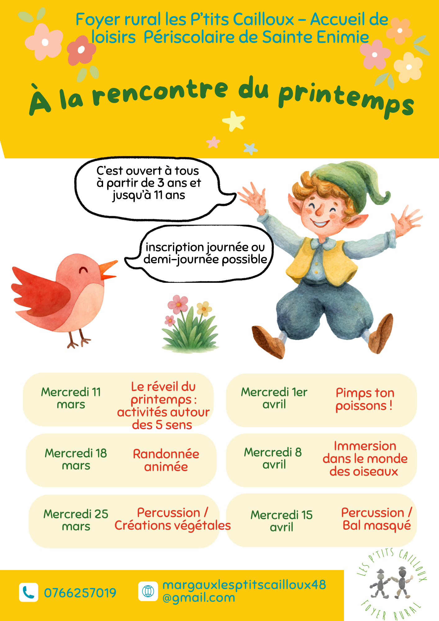 Avec le retour des beaux jours, Les P'tits cailloux ont envie de partir à la rencontre du printemps : créations végétales, ornithologie, randonnée, …