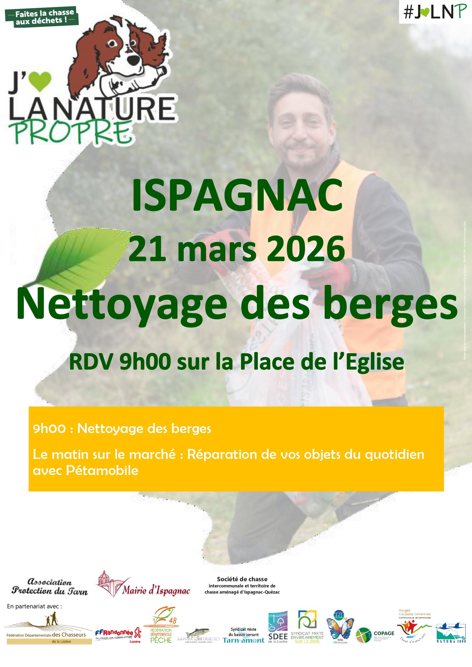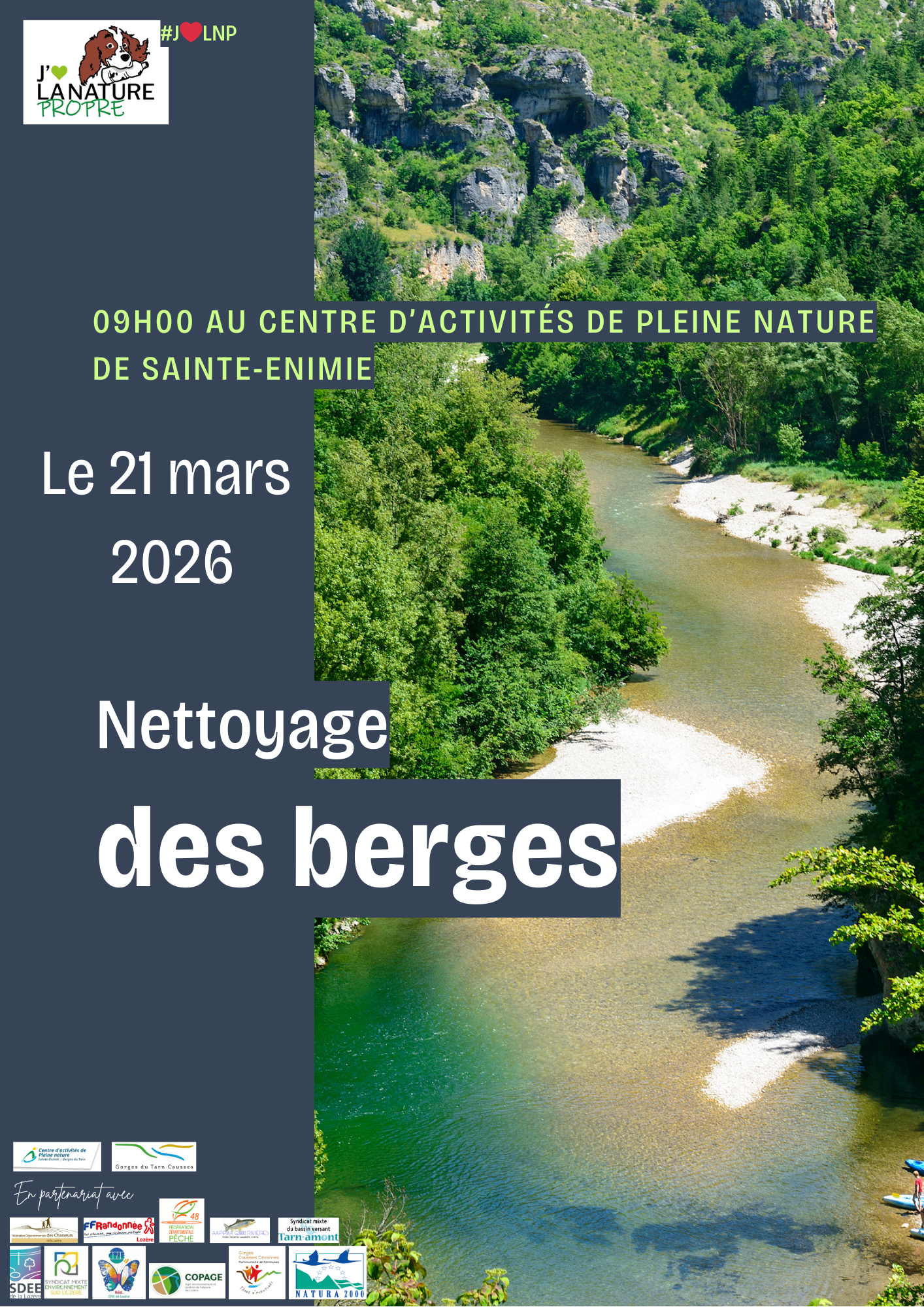 Les volontaires ou bénévoles sont invités à donner un peu de leur temps pour une demi-journée de nettoyage des berges du Tarn et de ses affluents. Cet événement s’inscrit dans le cadre de « J’aime la nature propre » porté par la Fédération des chasseurs. Il est coorganisé par le Syndicat Tarn-amont, les communes de Bédouès-Cocurès, de Florac-Trois-Rivières, de Vébron, d'Ispagnac, de Gorges-du-Tarn-Causses, l'Association de Protection du Tarn et sa vallée, l'association de pêche Florac Quatre Rivières, le Centre d'Activités de Pleine Nature et le foyer rural des Castors de Vébron.