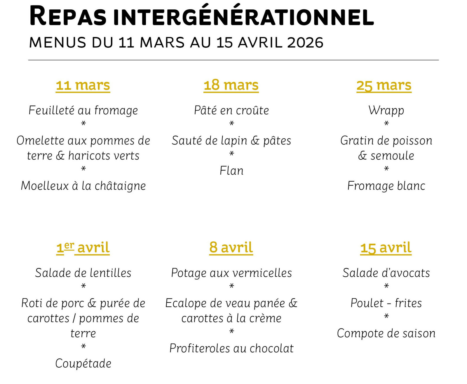 Voici les menu des prochains mois.